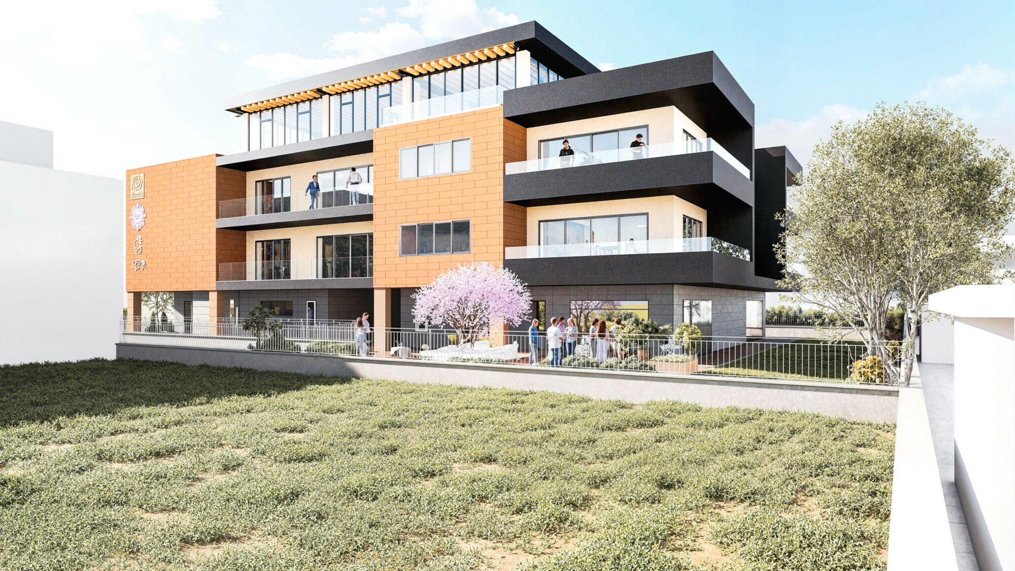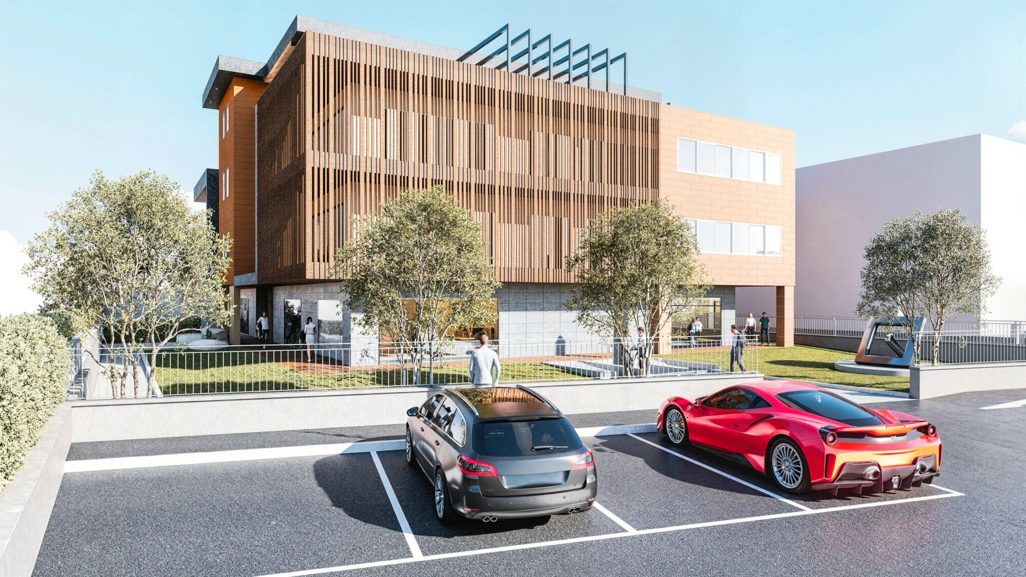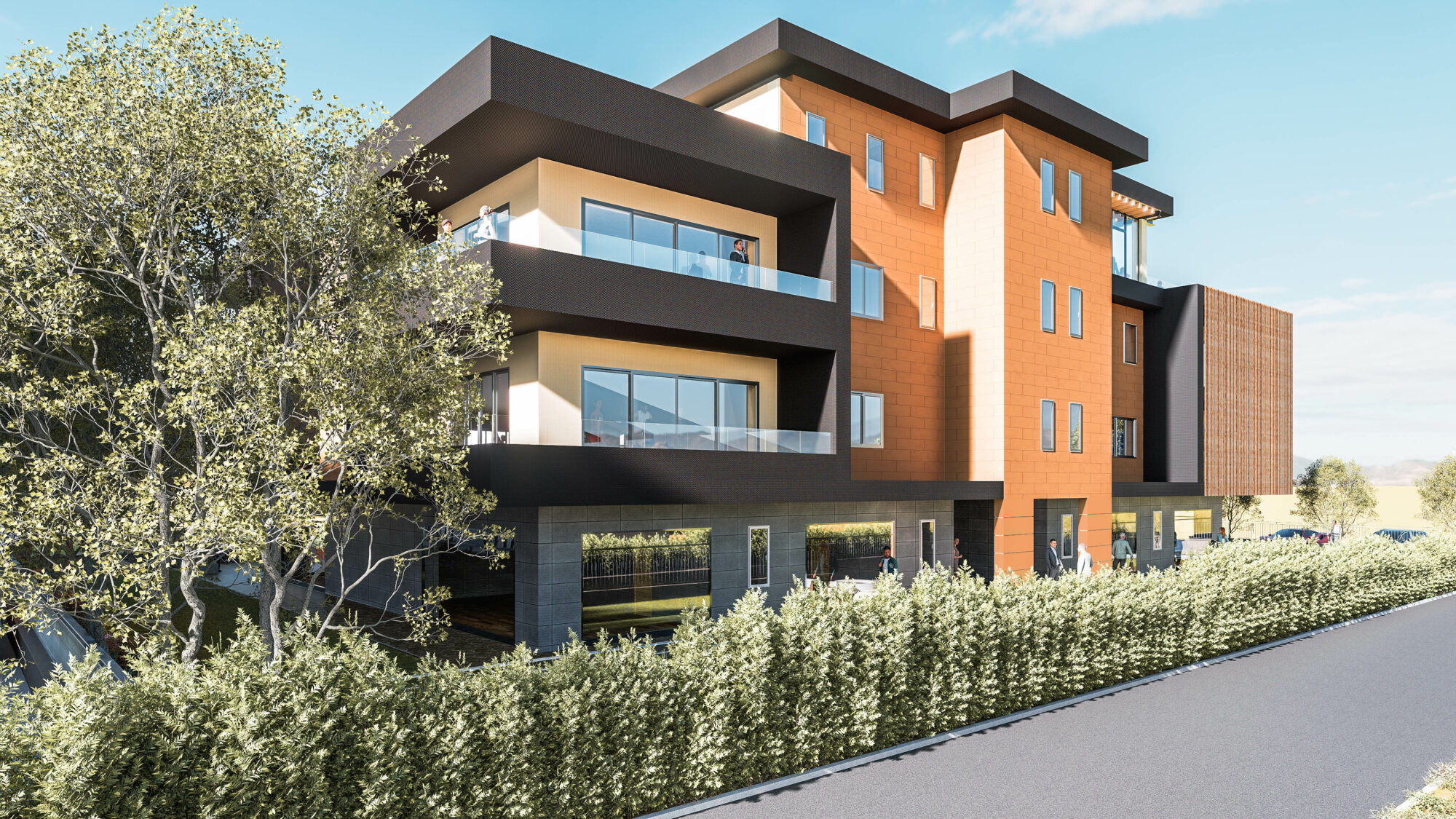 Il progetto prevede la realizzazione di un nuovo polo direzionale che integra uffici, spazi commerciali e aree ristoro. L’edificio si caratterizza per una composizione volumetrica essenziale, con rivestimenti color terracotta, ampie superfici vetrate e frangisole verticali. L’alternanza di pieni e vuoti definisce un’immagine contemporanea e ordinata.