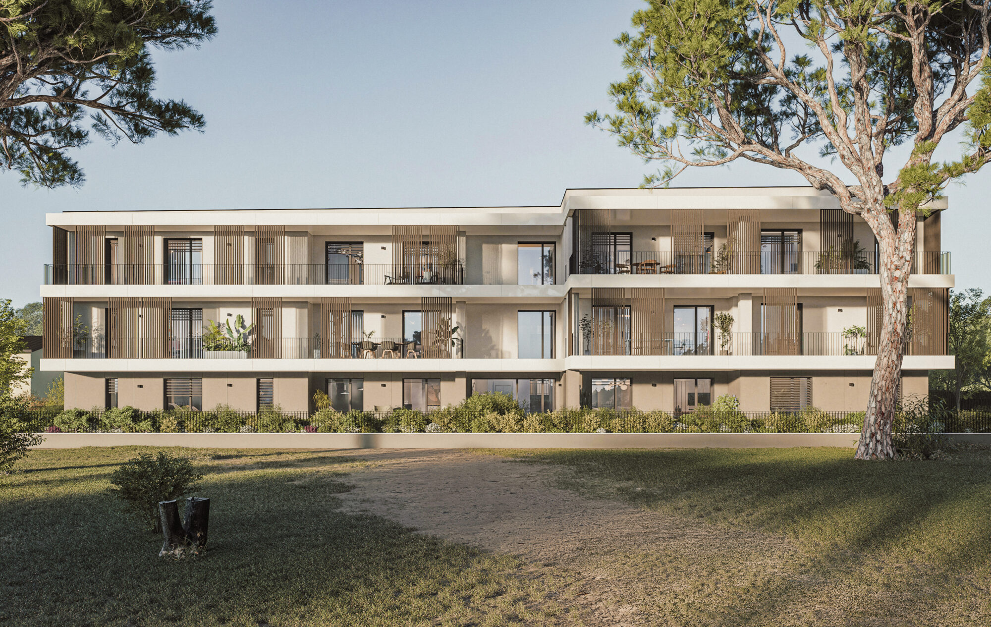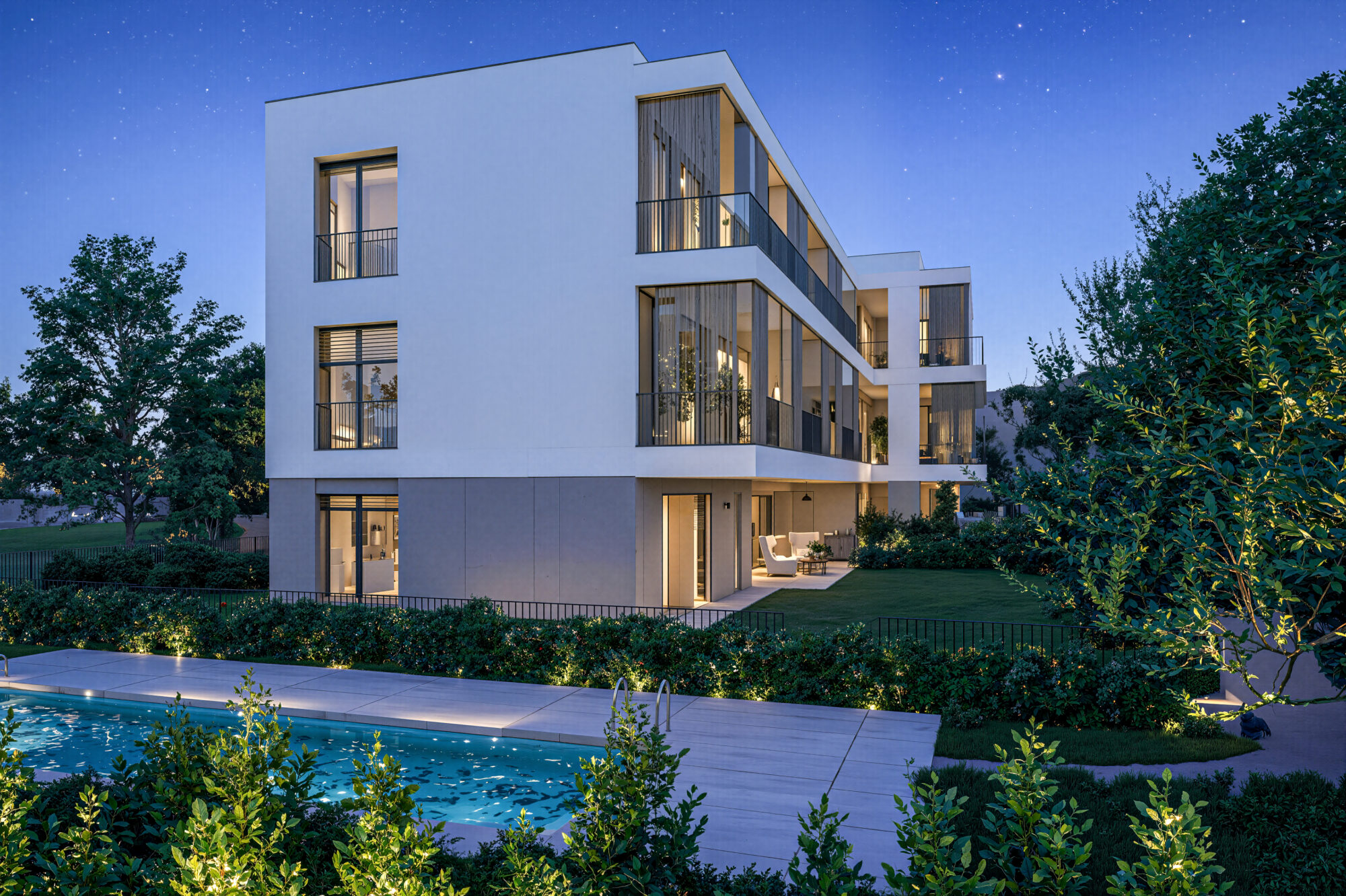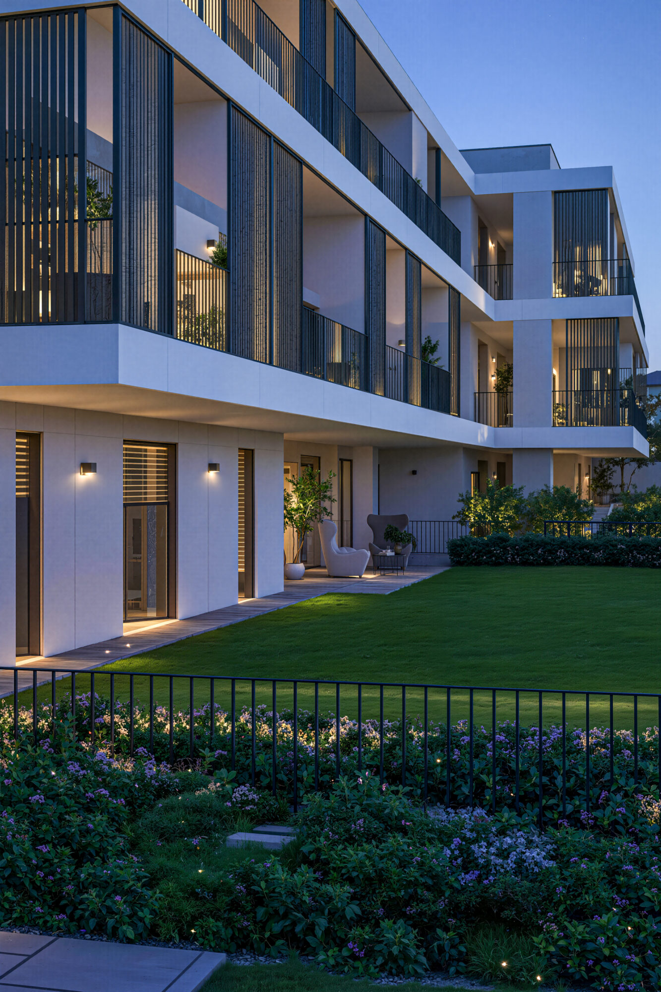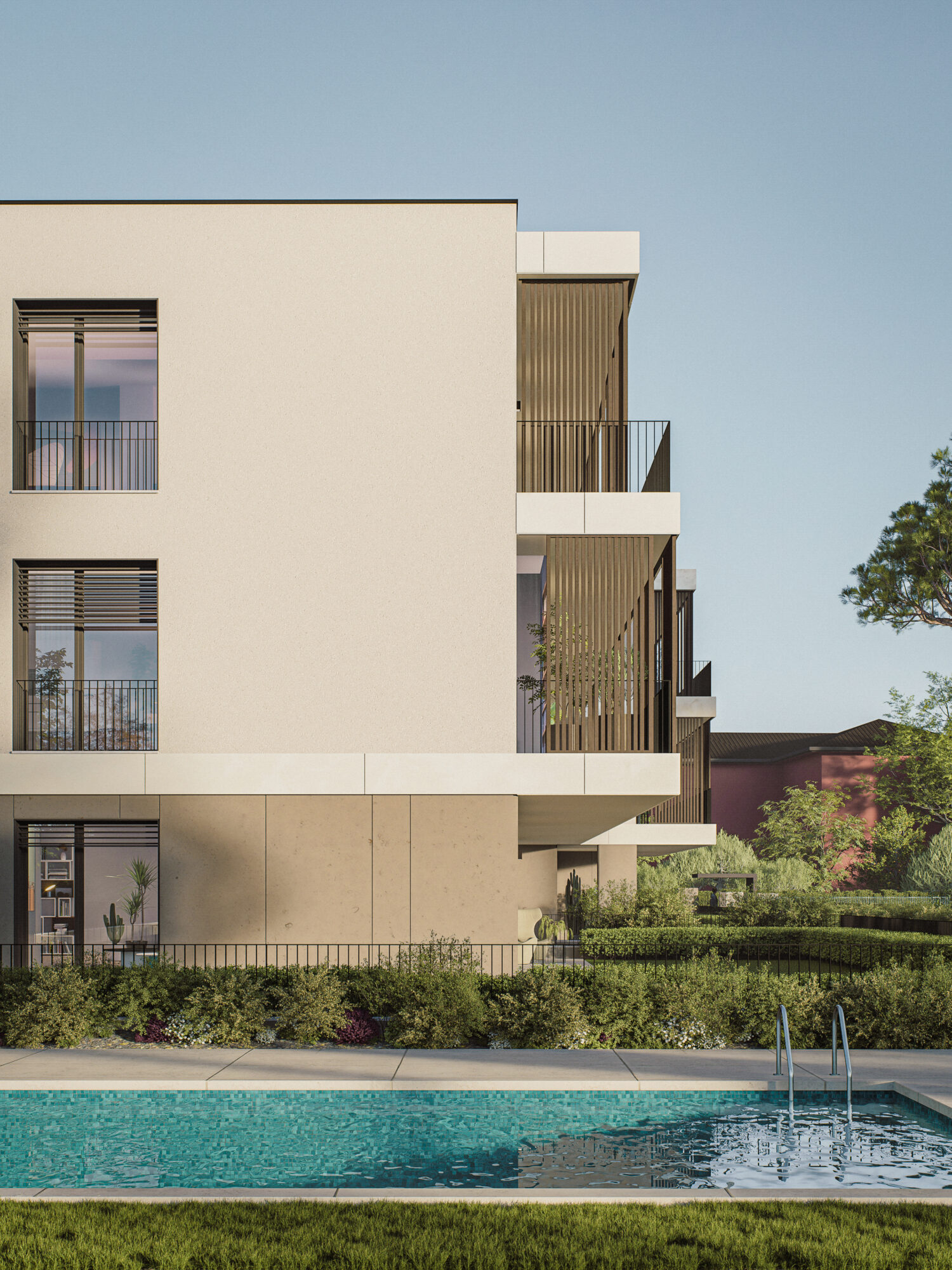 L’edificio si distingue per un linguaggio contemporaneo, caratterizzato da ampie logge affacciate sul verde e schermate da elementi verticali che garantiscono privacy, luce naturale e continuità tra interno ed esterno. Le aree comuni ospitano spazi verdi, percorsi e zone dedicate al relax, contribuendo a un’elevata qualità dell’abitare.