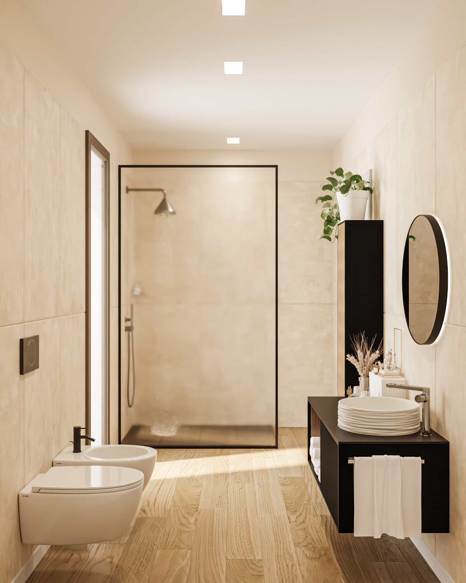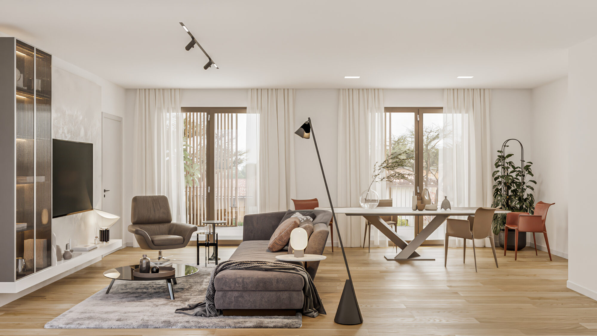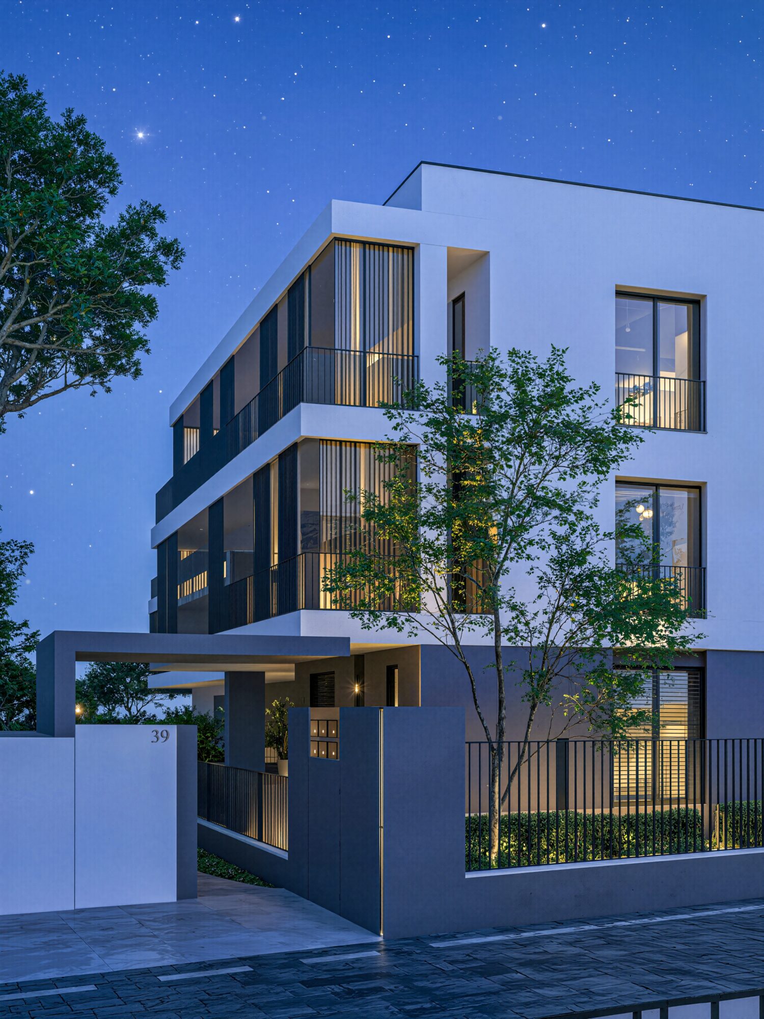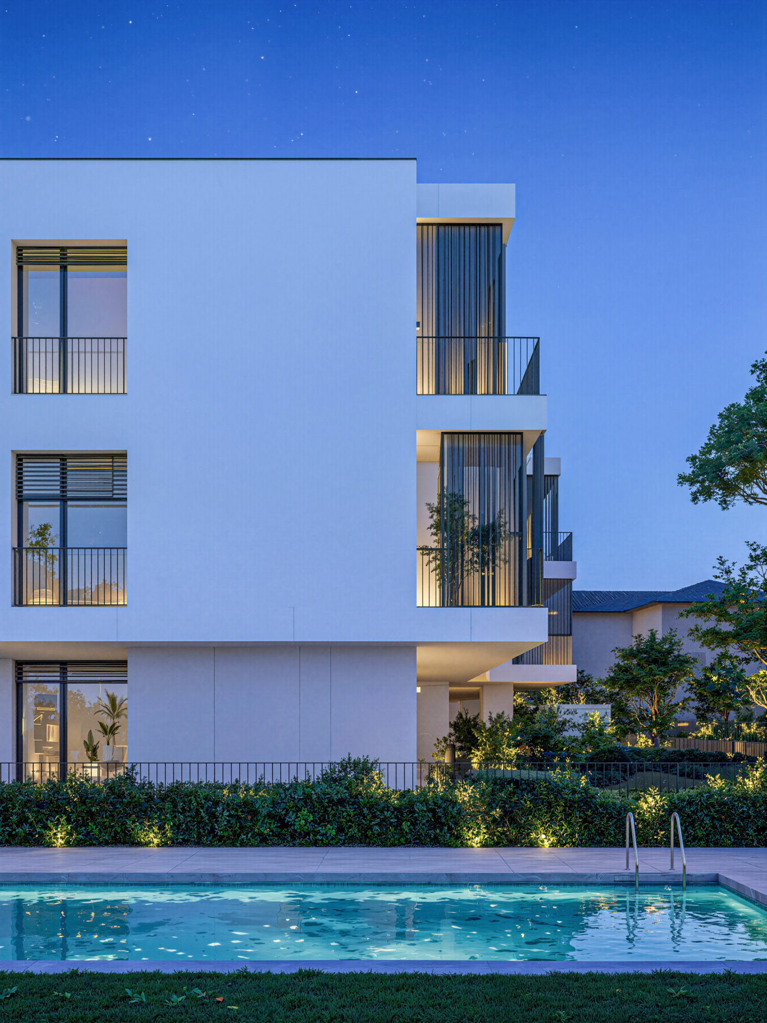 L’edificio si distingue per un linguaggio contemporaneo, caratterizzato da ampie logge affacciate sul verde e schermate da elementi verticali che garantiscono privacy, luce naturale e continuità tra interno ed esterno. Le aree comuni ospitano spazi verdi, percorsi e zone dedicate al relax, contribuendo a un’elevata qualità dell’abitare.